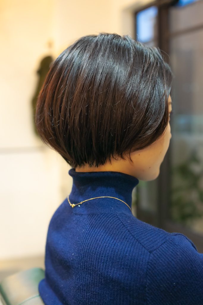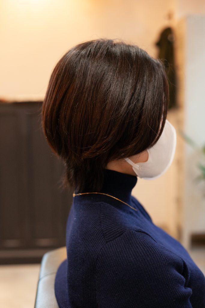 今回はくびれのある丸みがあるショートボブに。カラーはなるべく頭皮に刺激がないよう頭皮につけない